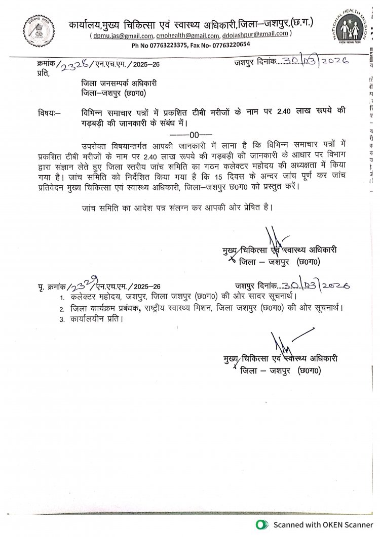टीबी मरीजों के नाम पर 2.40 लाख रुपये की गड़बड़ी, जशपुर में जांच समिति गठित