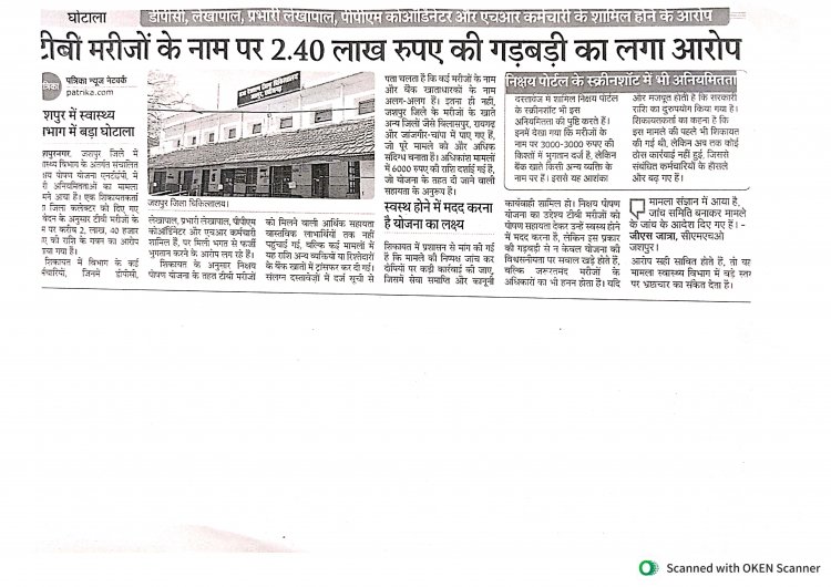 विभिन्न समाचार पत्रों में प्रकाशित खबरों के अनुसार, टीबी मरीजों को मिलने वाली आर्थिक सहायता राशि में अनियमितता पाई गई है। आरोप है कि कई मामलों में मरीजों के नाम पर राशि निकाली गई, लेकिन वास्तविक लाभार्थियों तक पैसा नहीं पहुंचा।