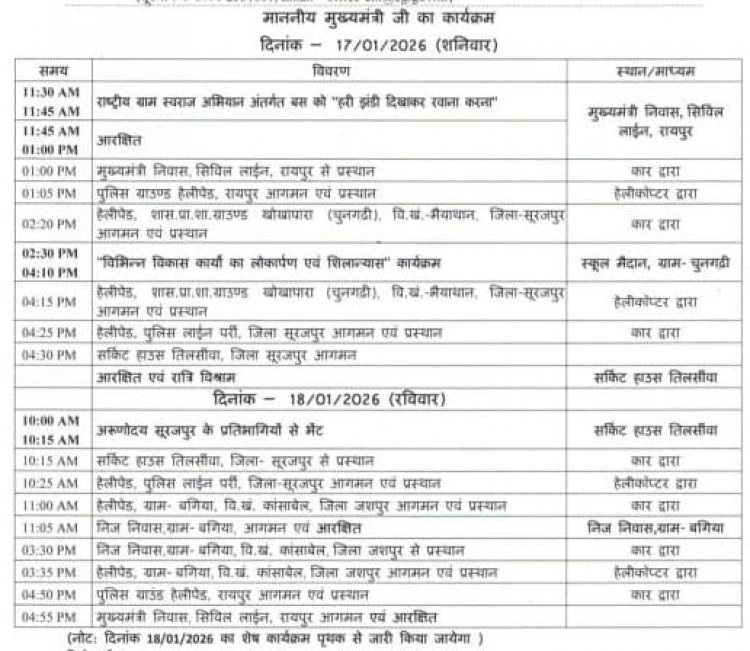 विशेष नोट: आधिकारिक सूचना के अनुसार, 18 जनवरी का शेष विस्तृत कार्यक्रम अलग से जारी किया जाएगा। प्रशासन द्वारा मुख्यमंत्री के आगमन को लेकर सुरक्षा और अन्य सभी तैयारियां पूरी कर ली गई हैं।