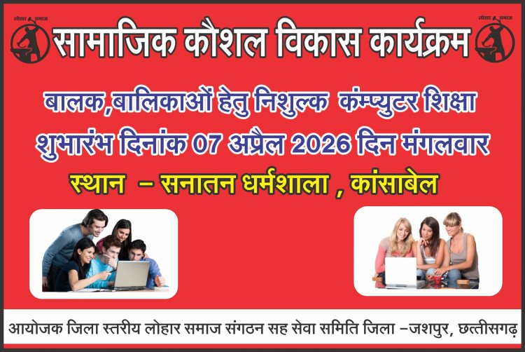 कांसाबेल | डिजिटल क्रांति के इस युग में समाज के युवाओं को तकनीकी रूप से सशक्त बनाने के लिए जिला स्तरीय लोहार समाज संगठन सह सेवा समिति, जशपुर ने एक बेहतरीन पहल की है। समिति द्वारा “सामाजिक कौशल विकास” कार्यक्रम के अंतर्गत समाज के 20 चयनित बच्चों को निःशुल्क कंप्यूटर प्रशिक्षण प्रदान किया जाएगा।
